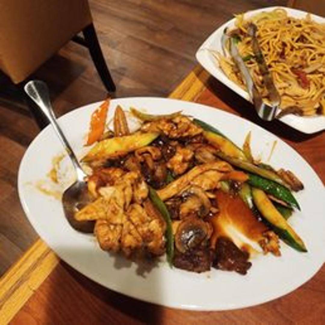 A stir-fried medley of shrimp, chicken, beef, and pork with a variety of fresh vegetables, including broccoli, carrots, mushrooms, and snow peas, in a rich brown sauce.