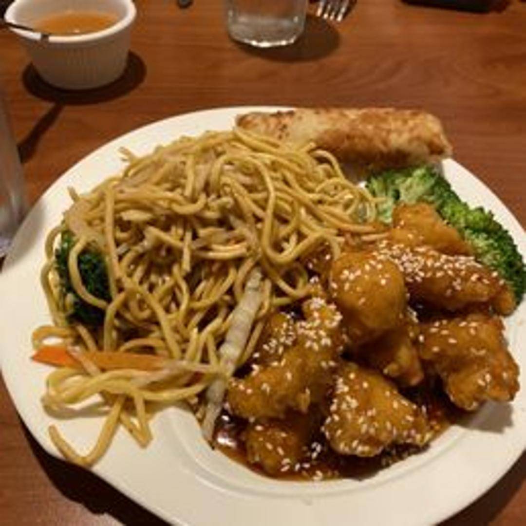 Crispy chicken coated in a sweet and savory sesame sauce. Topped with sesame seeds. Served with steamed rice.