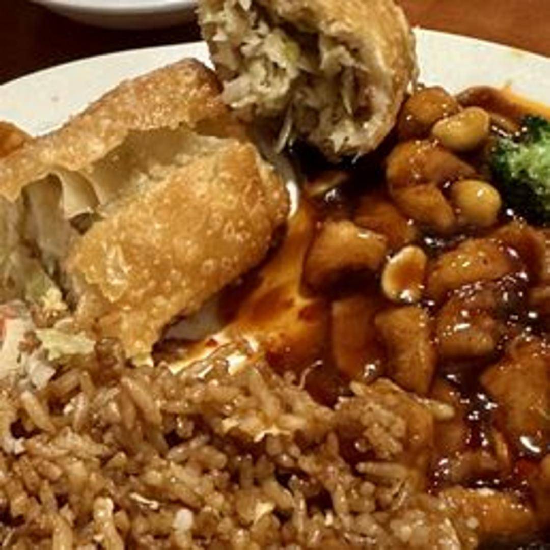 Stir-fried rice with diced pork, peas, carrots, scrambled egg, and soy sauce. Seasoned with sesame oil and spices.