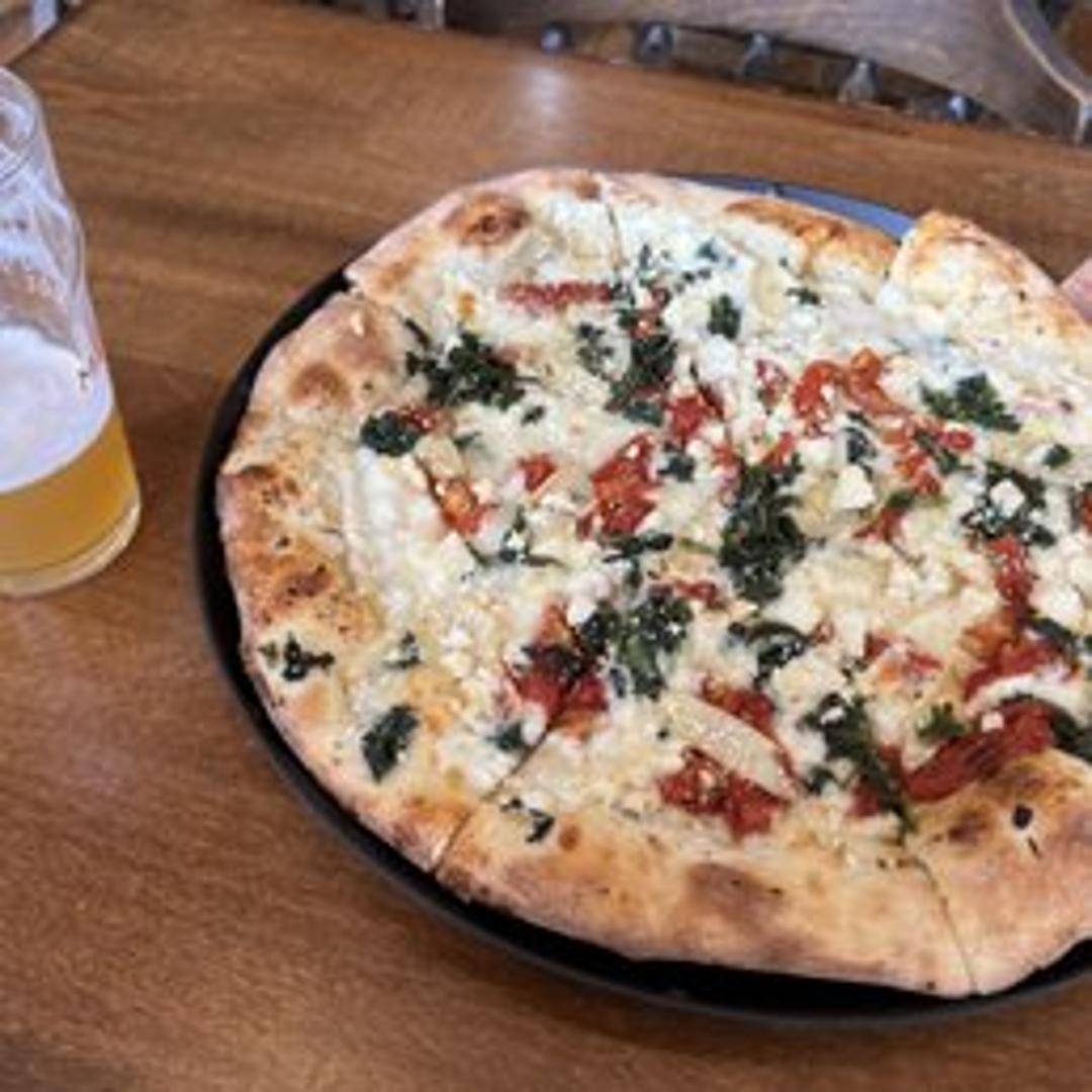 A delicious pizza featuring a white garlic sauce base, topped with fresh spinach, artichoke hearts, sun-dried tomatoes, Kalamata olives, feta cheese, and a sprinkle of oregano.