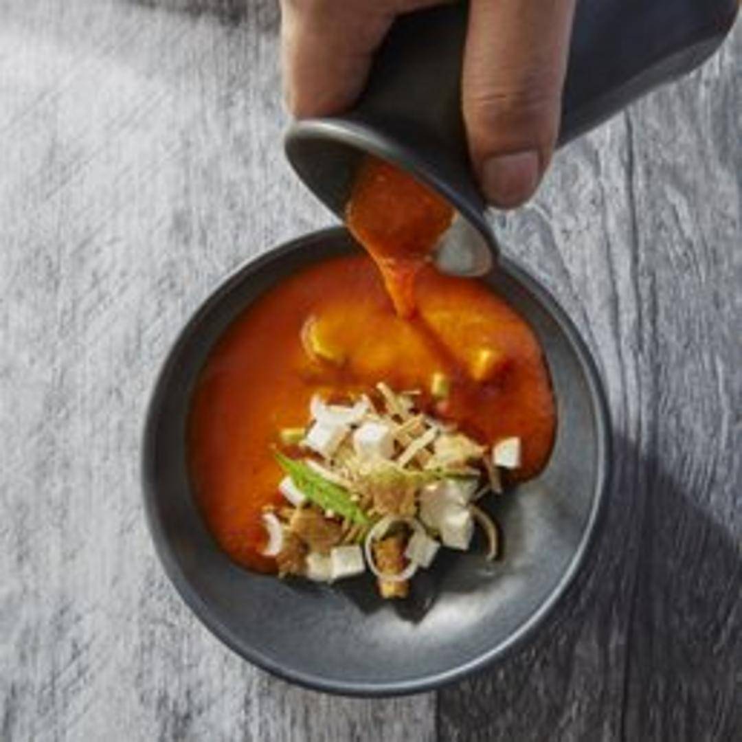 A rich and comforting traditional Mexican tortilla soup, featuring a deeply flavorful tomato-chile broth. Garnished generously with crispy tortilla strips, creamy avocado, crumbled cotija cheese, and a dollop of crema, offering a warm and authentic taste of Mexico.