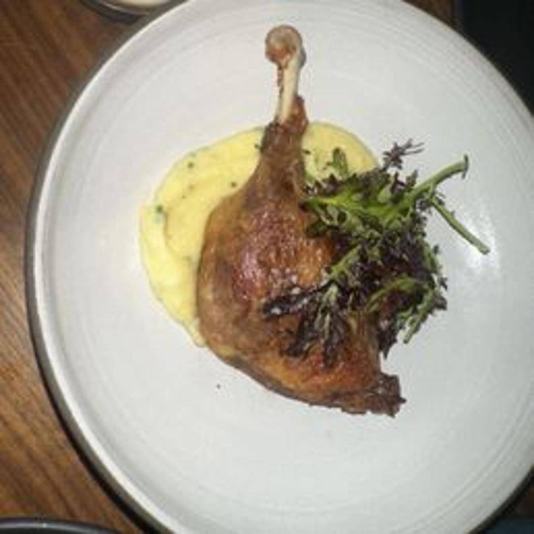 Duck leg cured in salt and spices then slow-cooked in its own fat until tender and richly flavored. Typically served with crispy skin and accompanied by seasonal vegetables or a complementary sauce.