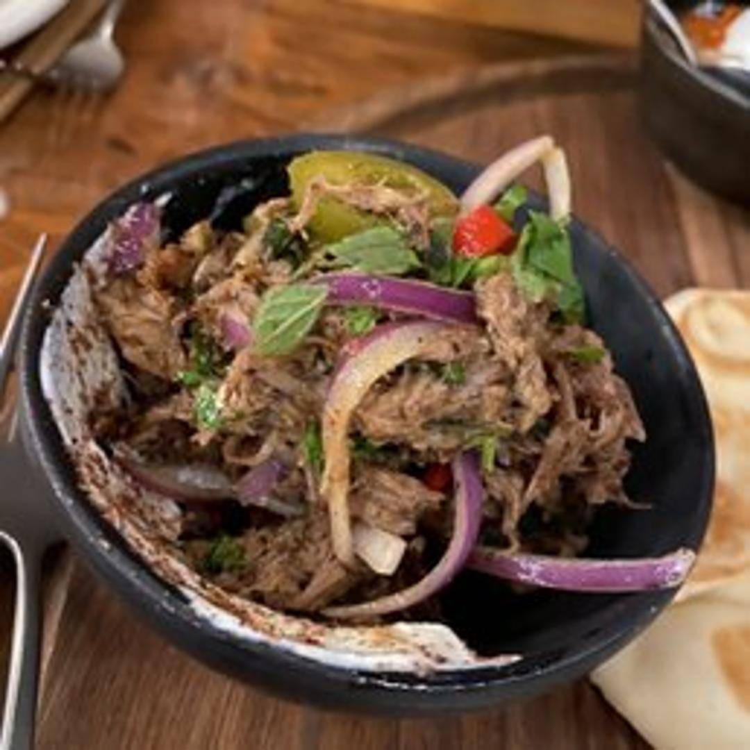 Ground lamb stir-fried with chili, cumin, and cilantro, served with rice cakes.