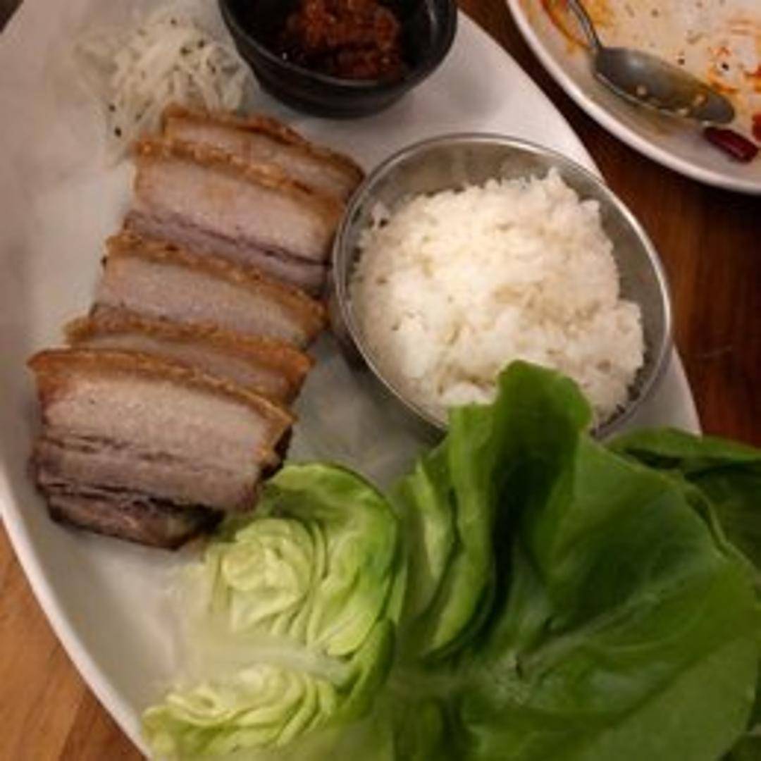 Slow-cooked and then crisped pork belly served with scallion pancakes, hoisin sauce, and ginger-scallion relish.