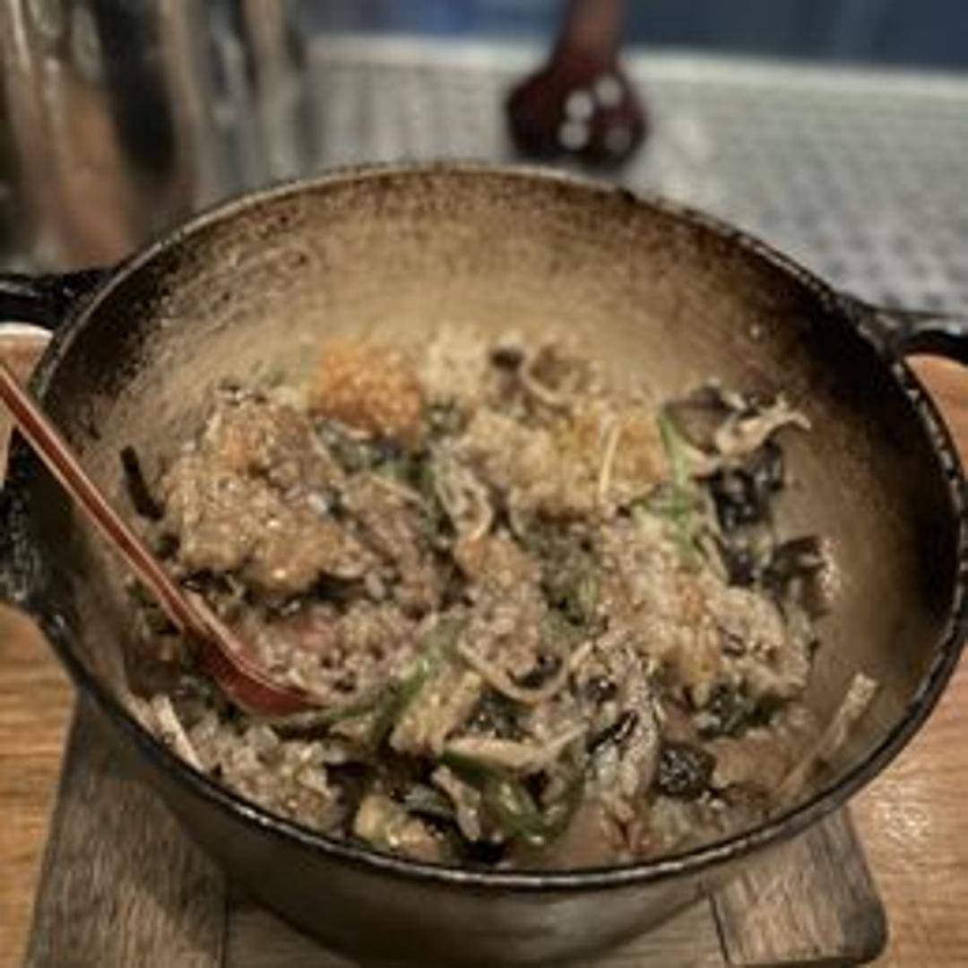 Savory crispy rice cakes topped with flavorful mushrooms. The rice cakes are likely pan-fried or deep-fried for a crunchy texture, and the mushroom topping is likely seasoned with umami-rich ingredients.