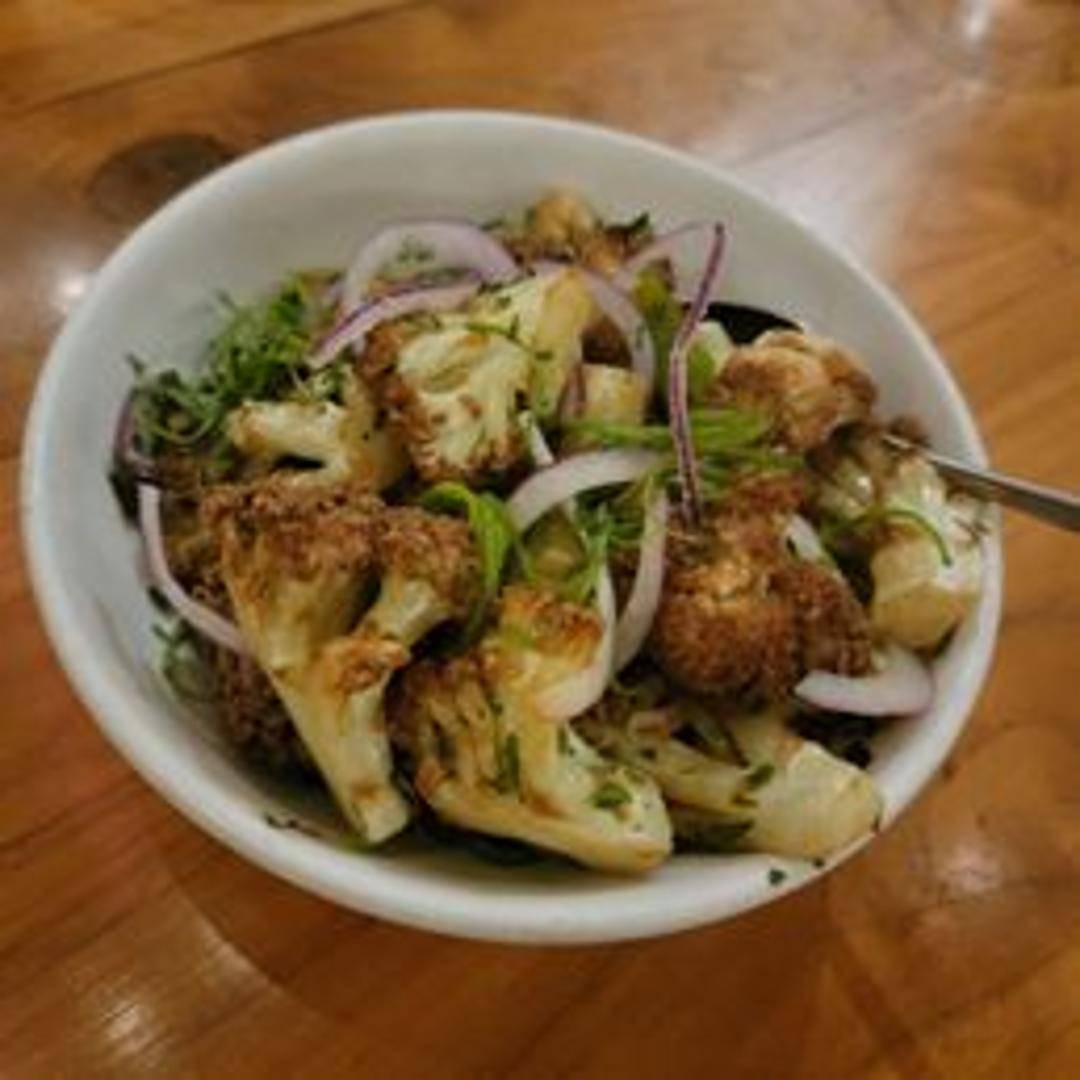Crispy, golden-brown fried cauliflower. It's likely seasoned with a blend of spices, and it might be served with a dipping sauce or topping, enhancing the flavor and texture.