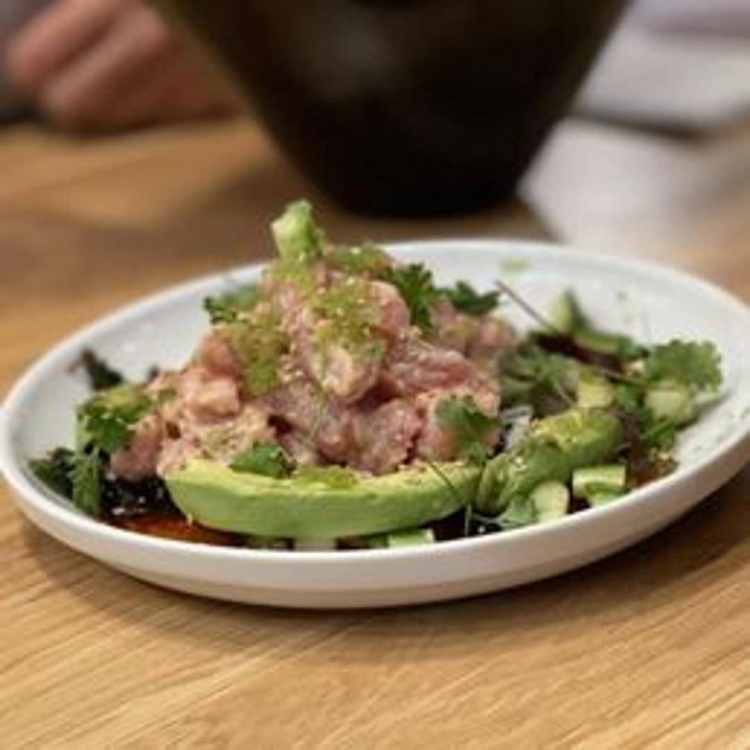 A Hawaiian-inspired appetizer featuring fresh, diced tuna marinated in a flavorful sauce, commonly soy sauce-based. Served with seaweed salad, avocado, and sesame seeds.