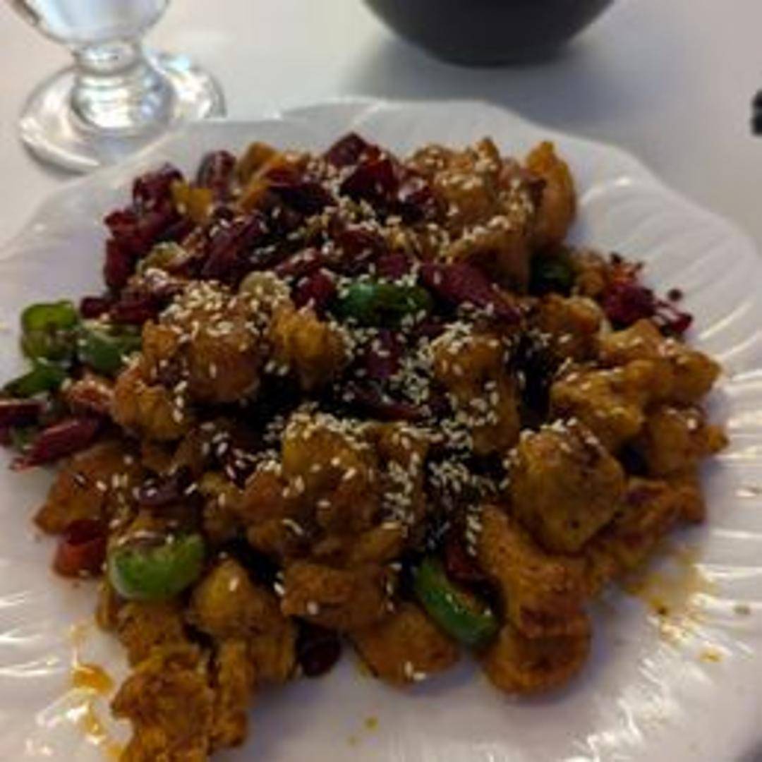 Crispy, bite-sized pieces of chicken stir-fried with a generous amount of dried chili peppers, Sichuan peppercorns, garlic, and ginger. Expect a bold, fiery flavor with a numbing sensation from the peppercorns. Served with a side of rice.