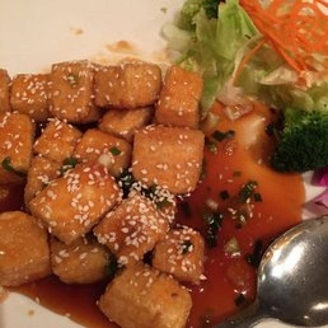 Golden-fried tofu cubes, perfectly crispy on the outside and tender within, coated in a delightful, savory-sweet glaze. Garnished generously with toasted sesame seeds, offering a satisfying crunch and a rich, nutty aroma. A superb vegetarian option.