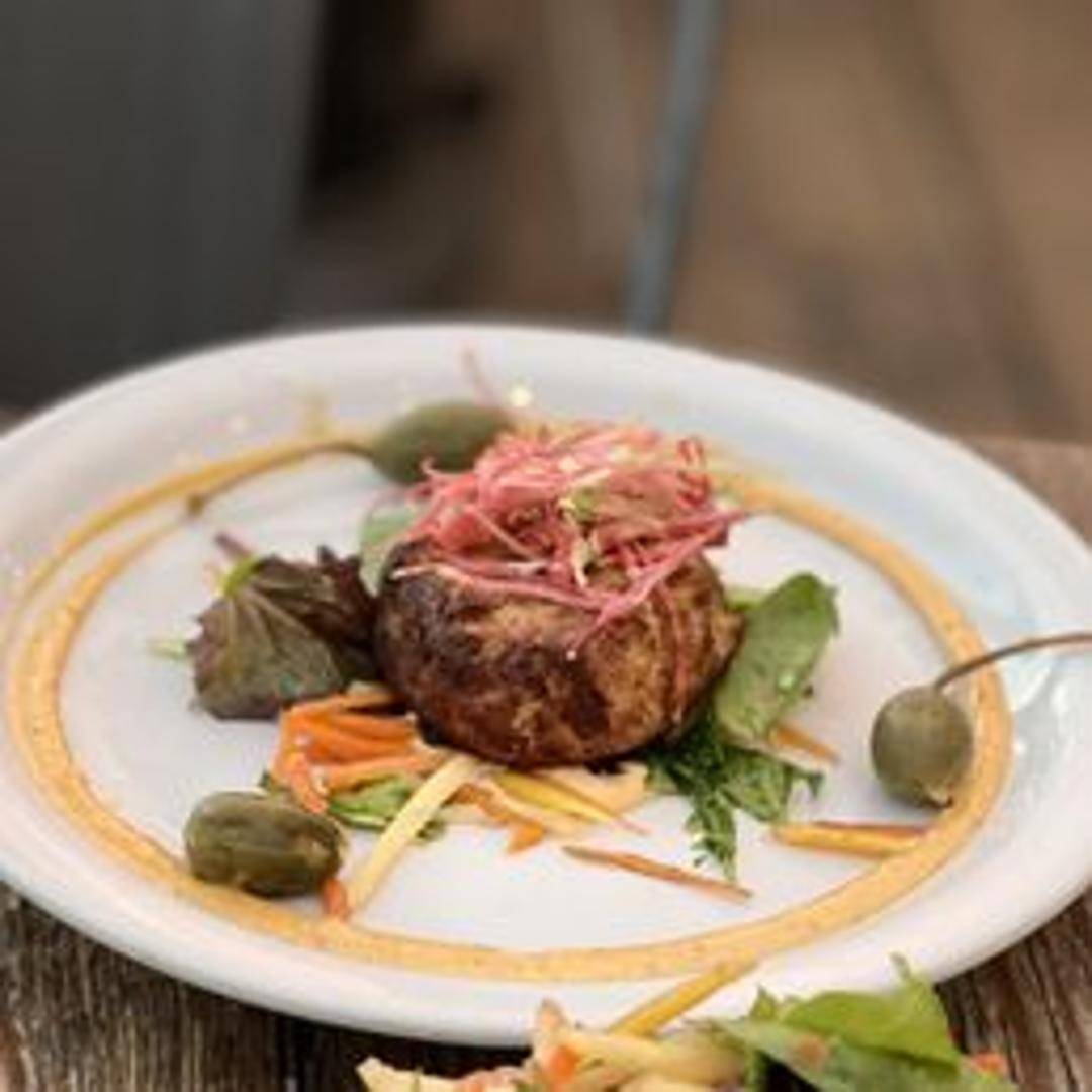 Pan-fried crab cakes, featuring fresh crab meat, seasoned with herbs and spices. Served with a lemon aioli or similar light sauce, and often accompanied by a small salad or side of greens.