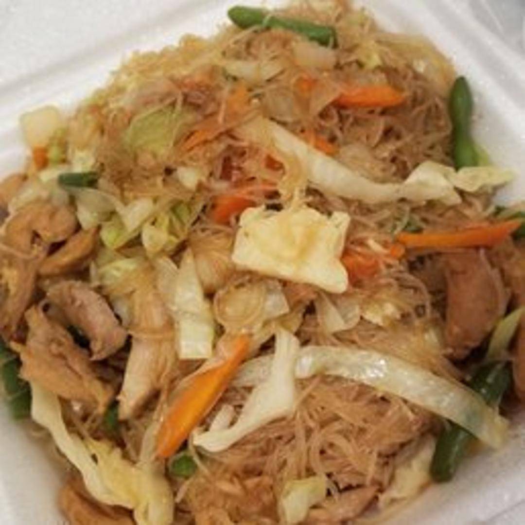 A Filipino noodle dish made with stir-fried chicken, vegetables (such as cabbage, carrots, and bell peppers), and thin rice noodles (bihon). Seasoned with soy sauce and other savory spices.