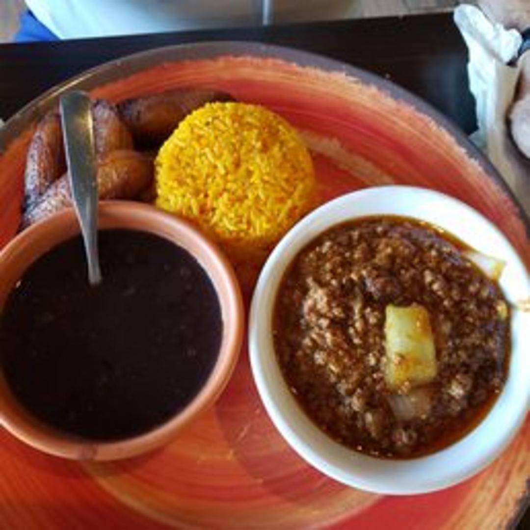 A savory and slightly sweet Cuban dish made with ground beef simmered in a tomato-based sauce with olives, raisins, and potatoes. Served with your choice of rice and plantains.