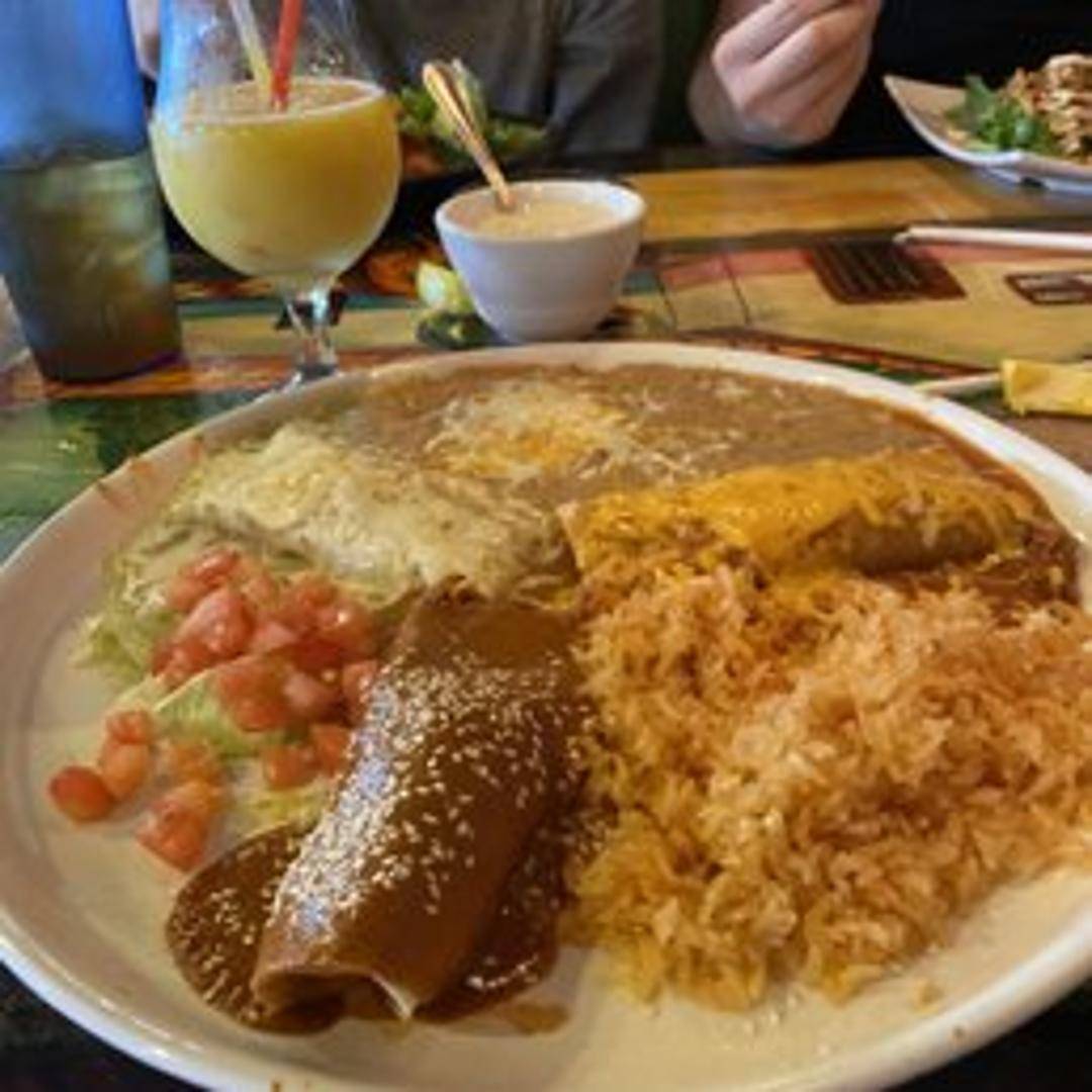 A flavorful combination of three enchiladas, each with a different filling and sauce. Includes one chicken enchilada with creamy tomatillo sauce, one cheese enchilada with classic red sauce, and one beef enchilada with rich mole sauce. Topped with melted cheese and served with rice and beans.