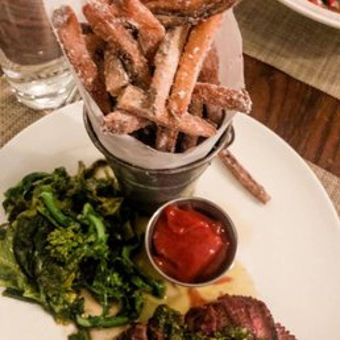Grilled hanger steak served with crispy, seasoned french fries and a flavorful herbed butter.
