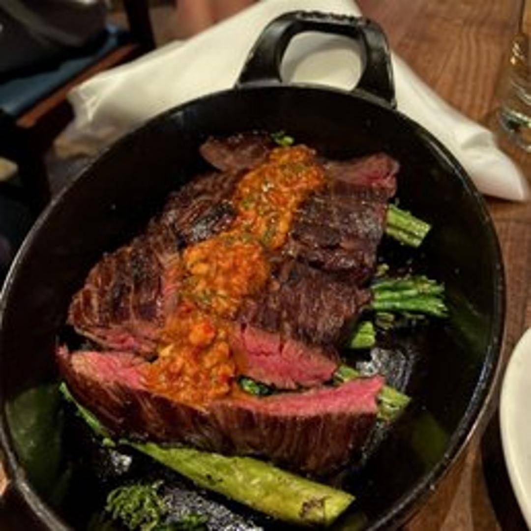A masterfully prepared cut of premium steak, expertly grilled over authentic white oak wood, infusing it with a delicate yet distinct smoky char. Expertly cooked to highlight its natural succulence and rich beef flavor, offering a truly elevated steak experience characteristic of Manhattan Beach Post's wood-fired expertise.