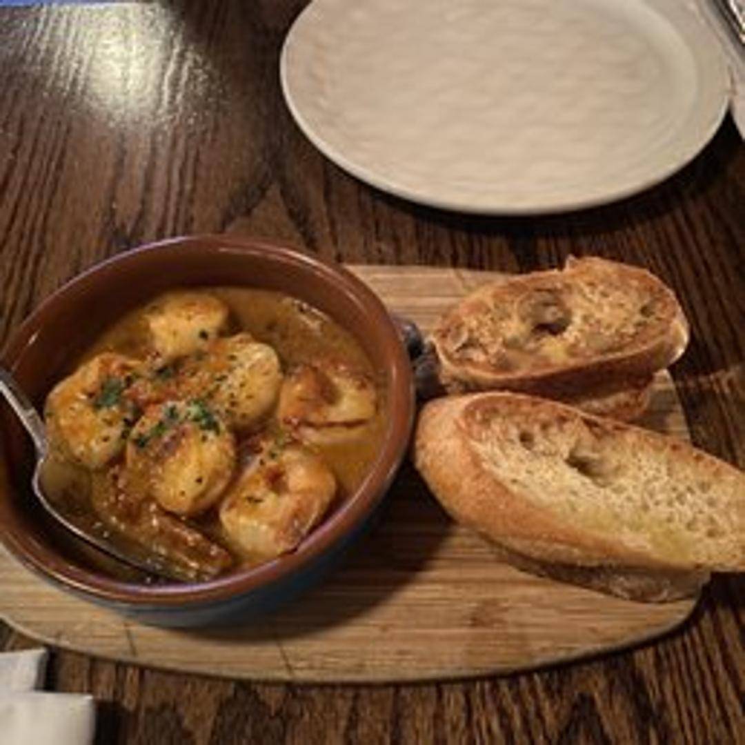 Sautéed shrimp in a garlic, white wine, and butter sauce, served with grilled bread.