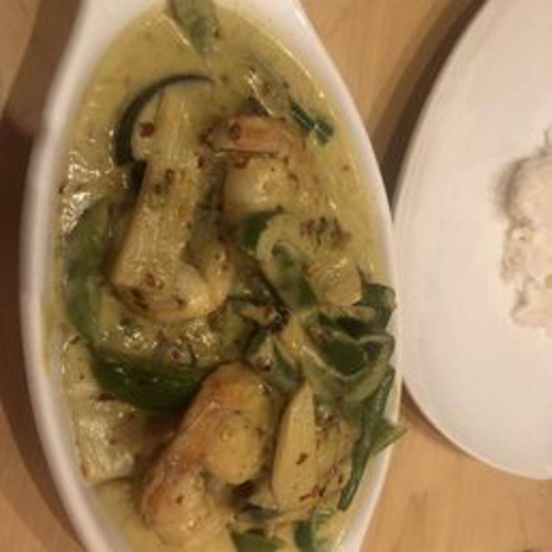Authentic Thai green curry simmered in coconut milk with bamboo shoots, bell peppers, green beans, and basil leaves. Choose your preferred protein and spice level. Served with steamed rice.