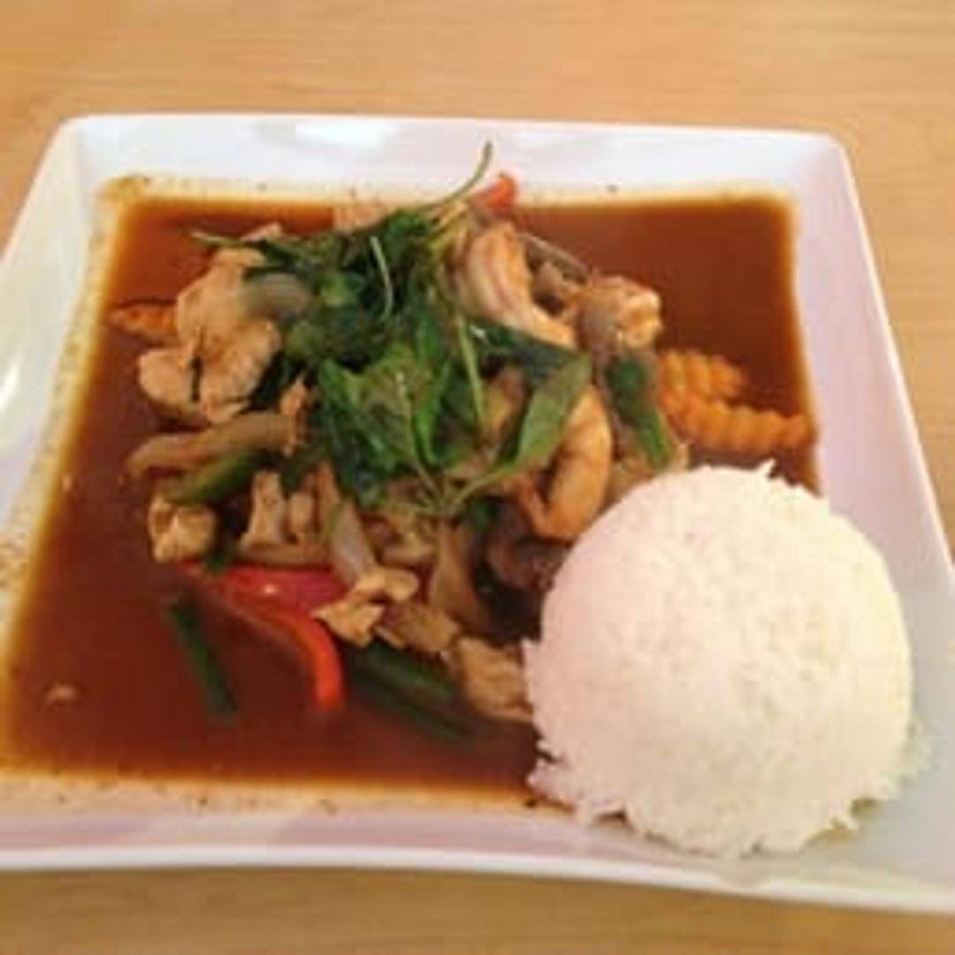 A stir-fried dish featuring your choice of protein (chicken, pork, beef, tofu, or shrimp) sautéed with red bell peppers, green beans, onions, carrots, and basil in a flavorful Thai chili paste sauce. Served with steamed rice.