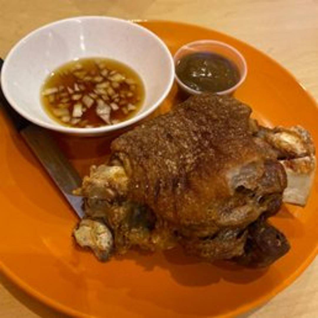 A popular Filipino dish featuring a whole pork leg, deep-fried to crispy perfection. The skin is crackling and crunchy, while the meat remains tender and flavorful. Served with a dipping sauce.