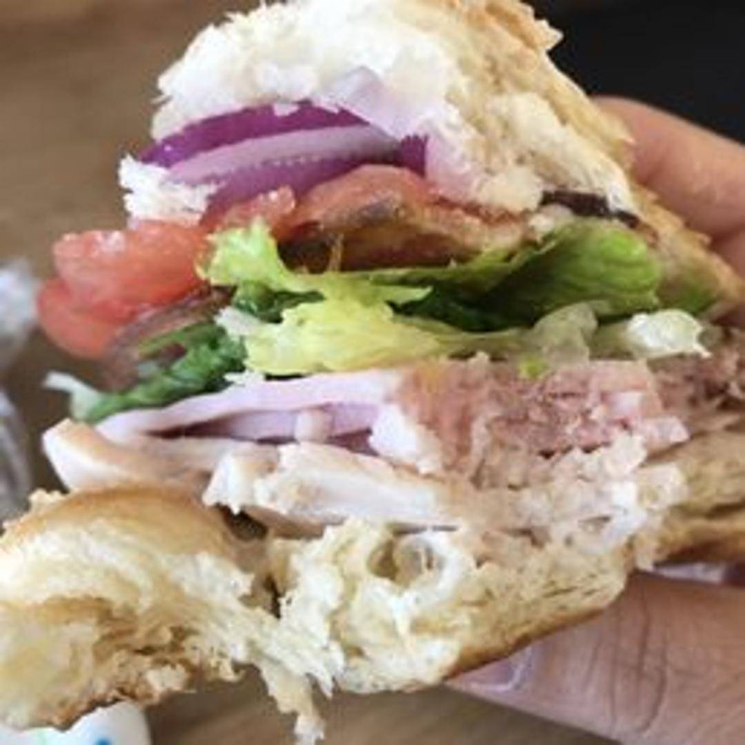 A triple-decker sandwich layered with sliced turkey, ham, crispy bacon, fresh lettuce, ripe tomatoes, and mayonnaise on toasted bread.