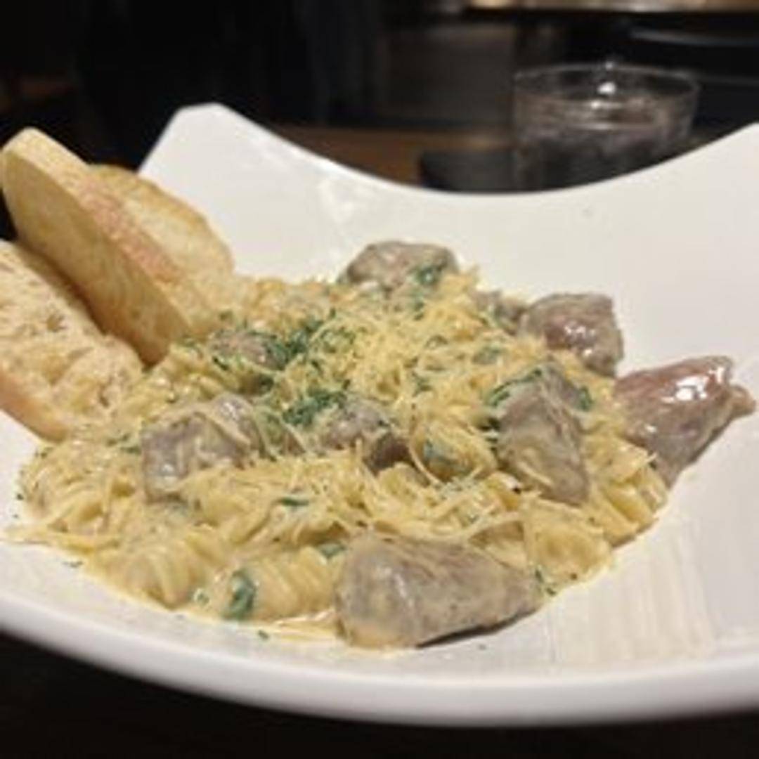 Tender steak tips tossed with pasta in a rich Gorgonzola cream sauce.