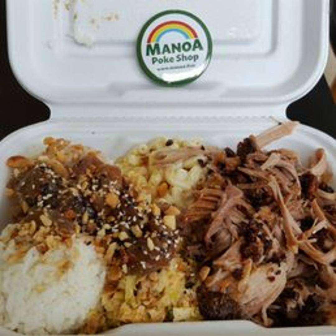 A hearty plate featuring a generous portion of grilled or smoked meat (typically kalua pig or teriyaki chicken), served with a scoop of rice and a side of mac salad. A classic Hawaiian comfort food.