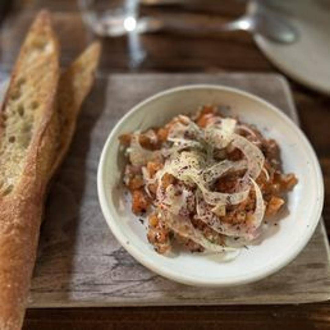 Finely diced raw ocean trout mixed with capers, shallots, chives, and a touch of lemon juice. Served with toasted baguette slices.