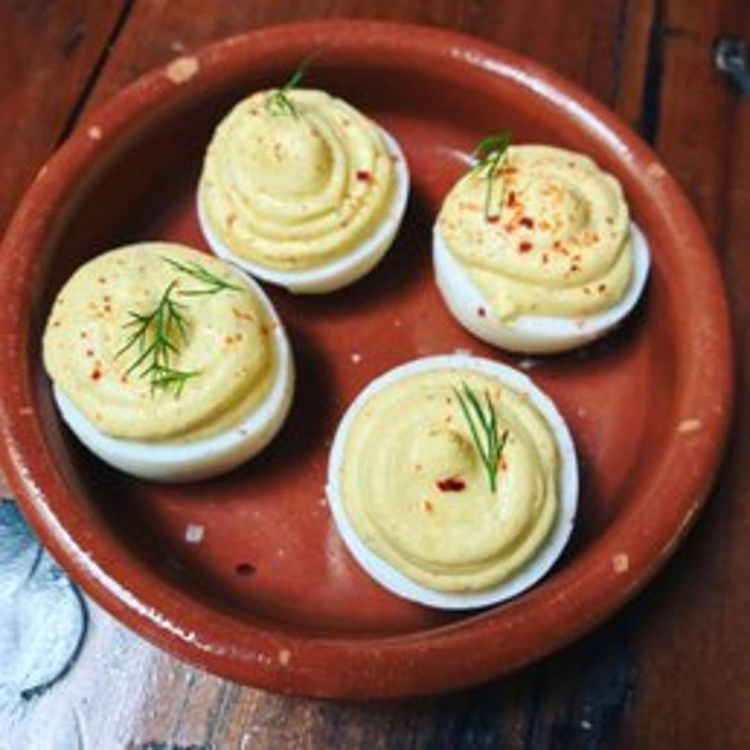 Classic deviled eggs elevated with Manuela's signature touch. Creamy yolk filling seasoned with a blend of spices, herbs, and a hint of tang. Garnished with paprika and fresh herbs.