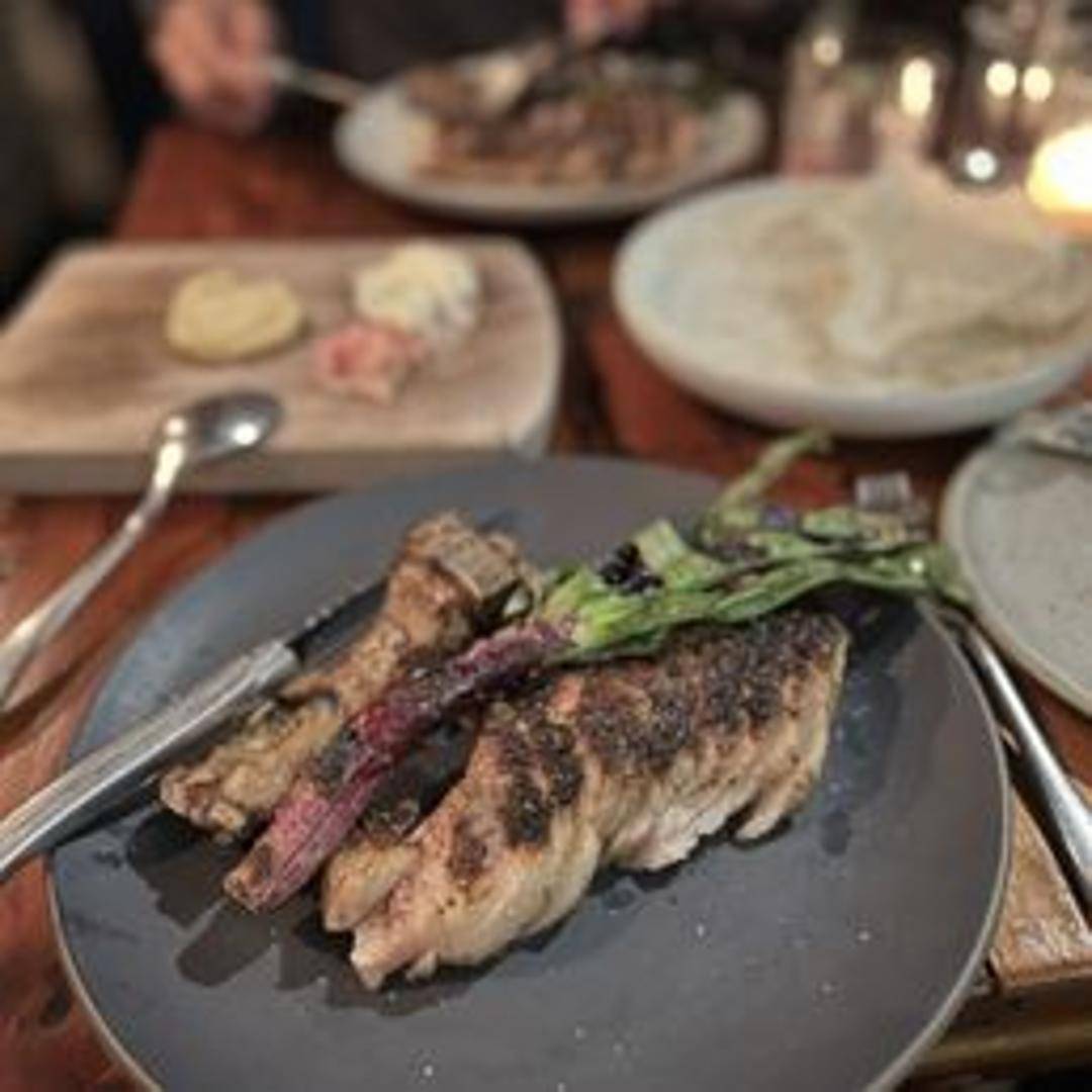 A thick-cut pork chop, grilled or pan-seared to perfection. Seasoned with a blend of herbs and spices. Served with a side of seasonal vegetables and a flavorful sauce.