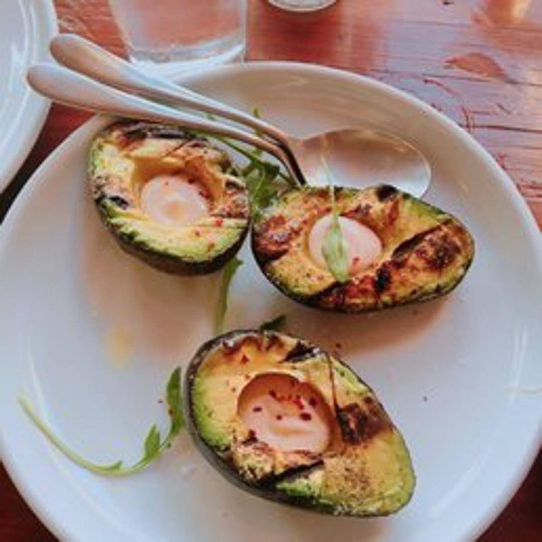 Smoked and grilled avocado, served with a light vinaigrette, seasonal herbs, and toasted bread. The avocado is creamy and smoky with a slight char, complemented by fresh flavors from the herbs and a textural contrast from the toasted bread.