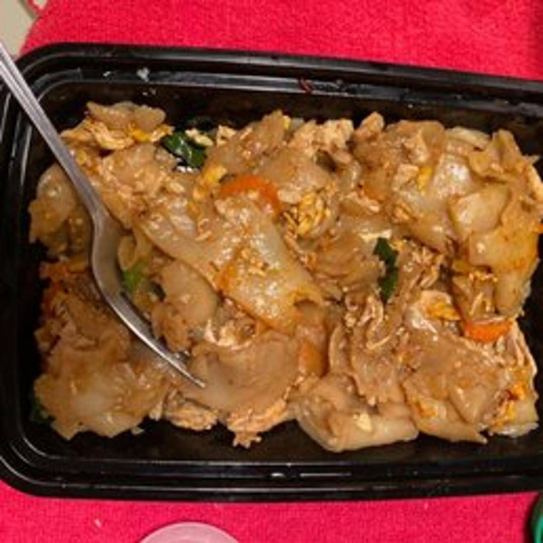 A beloved Thai stir-fried noodle dish featuring wide, flat rice noodles (sen yai) tossed in a dark, savory sauce. The sauce is a harmonious blend of dark soy sauce, light soy sauce, and often a touch of vinegar or sugar, giving it a distinctive sweet and salty umami flavor. It typically includes Chinese broccoli and slices of your chosen protein, all wok-fried to create a slightly charred, smoky aroma.