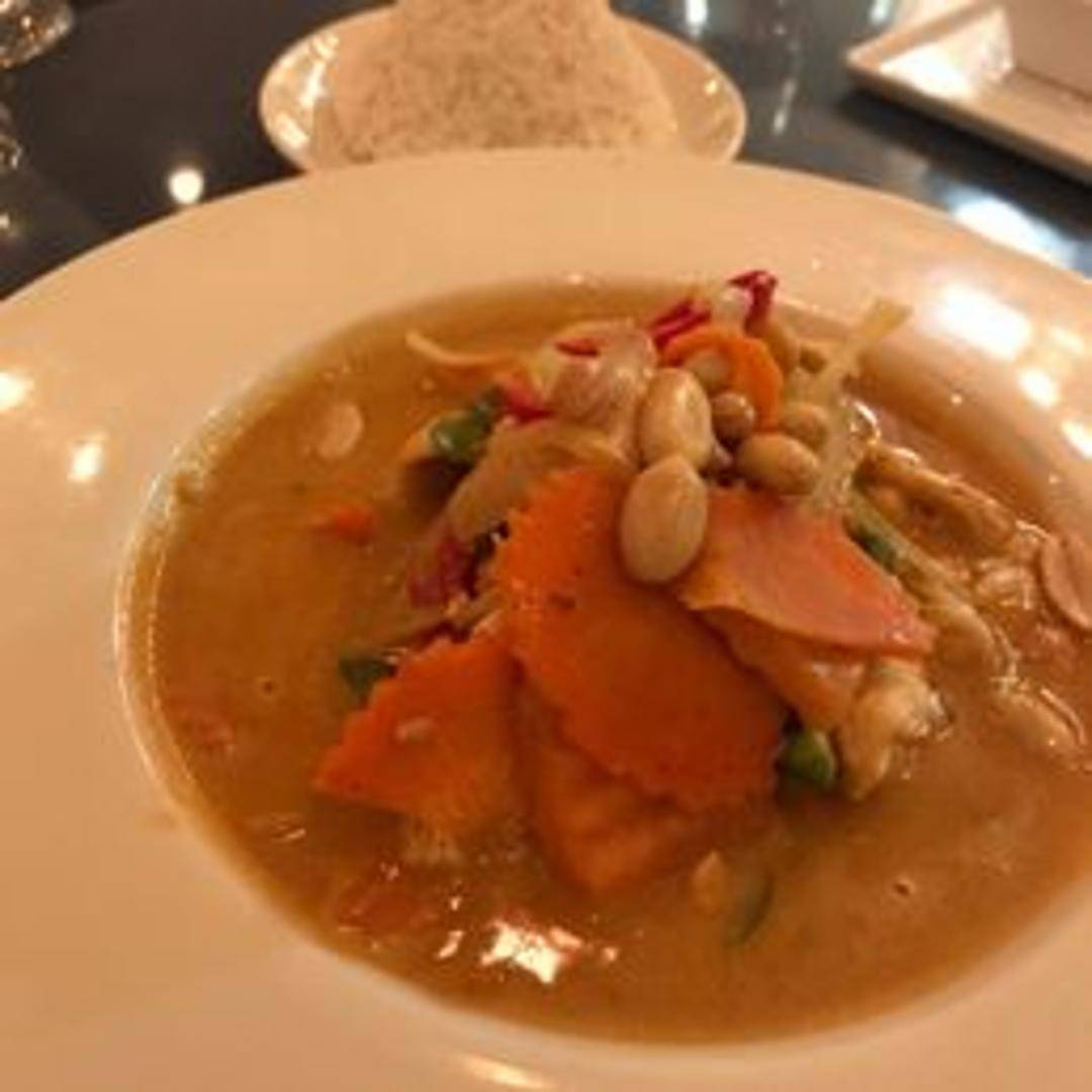 A rich, mild, and distinctly aromatic Thai curry with Persian influences, characterized by its unique blend of spices including cardamom, cinnamon, cloves, star anise, cumin, and nutmeg, along with traditional Thai ingredients. Cooked in creamy coconut milk, it often features tender potatoes, roasted peanuts, and onions, creating a subtly sweet, savory, and tangy flavor profile that is less spicy and incredibly comforting.
