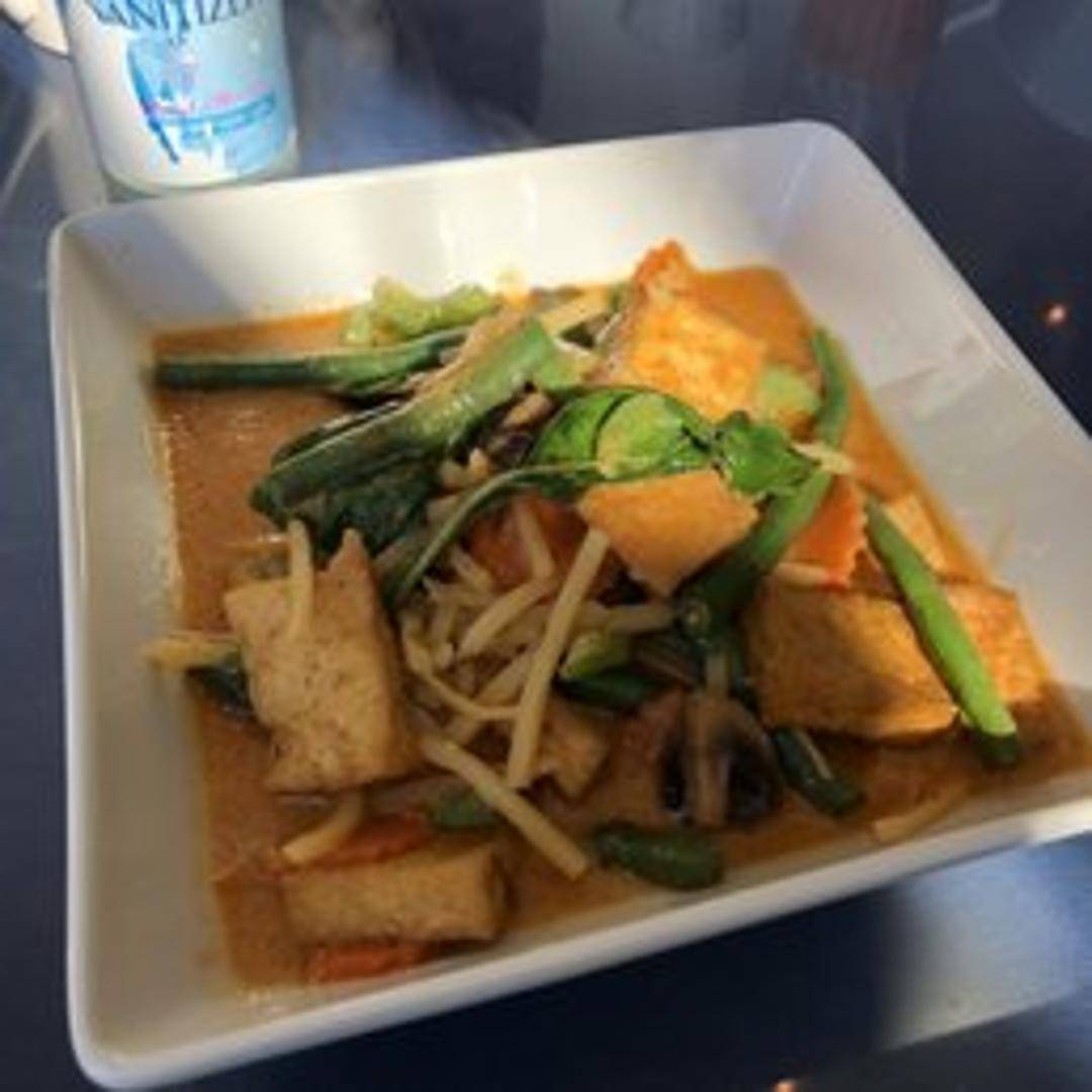 Indulge in our vibrant Red Curry, a classic Thai dish renowned for its rich and spicy coconut milk base infused with red chilies, galangal, lemongrass, kaffir lime leaves, and other aromatic spices. This flavorful curry is simmered with your choice of protein and a medley of bamboo shoots, bell peppers, and fresh basil, delivering a harmonious blend of sweet, savory, and spicy flavors.