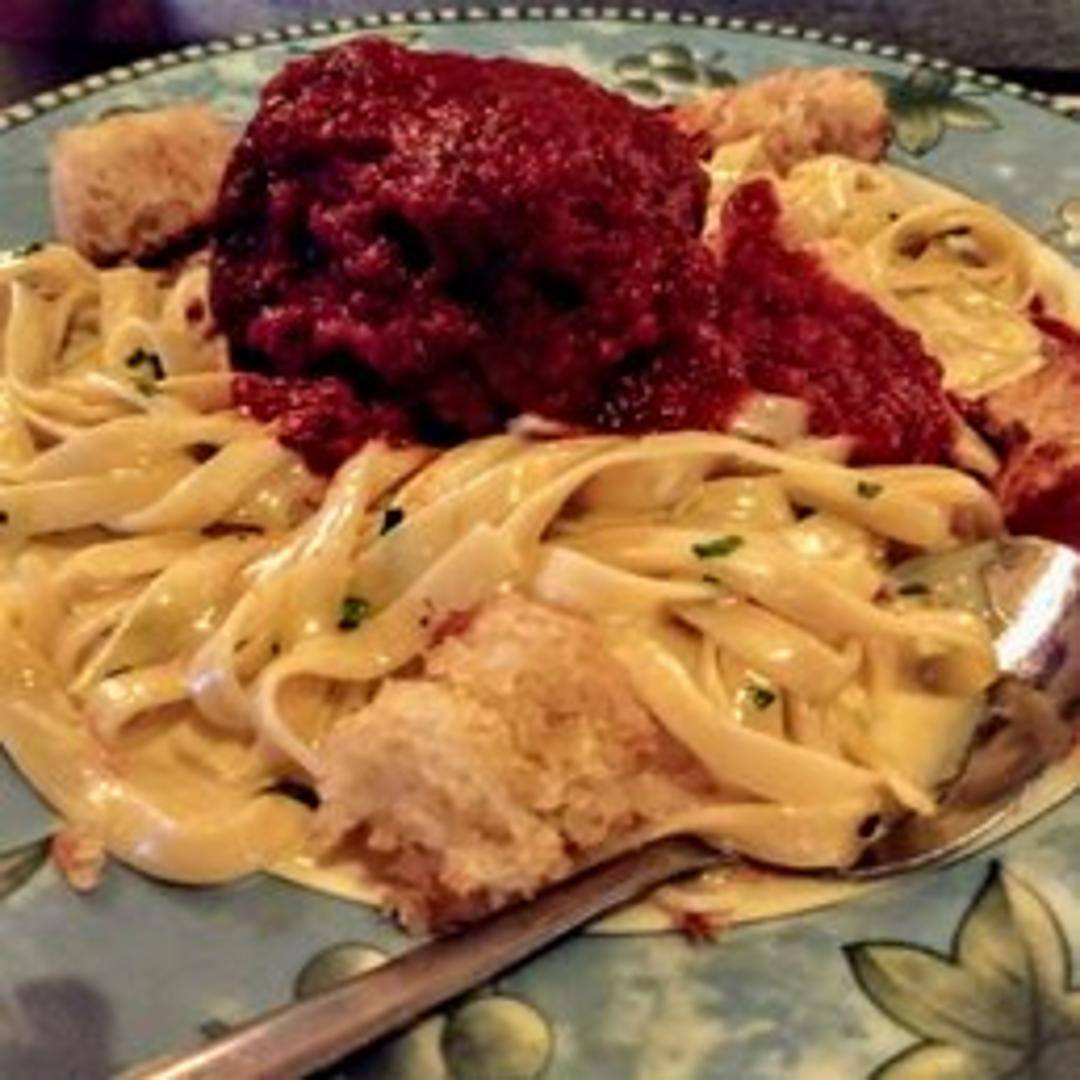 Long, flat strands of fettuccine pasta perfectly coated in a luxurious and velvety Alfredo sauce, traditionally made with rich butter, heavy cream, and an abundance of freshly grated Parmesan cheese, creating a comforting and classic Italian dish.