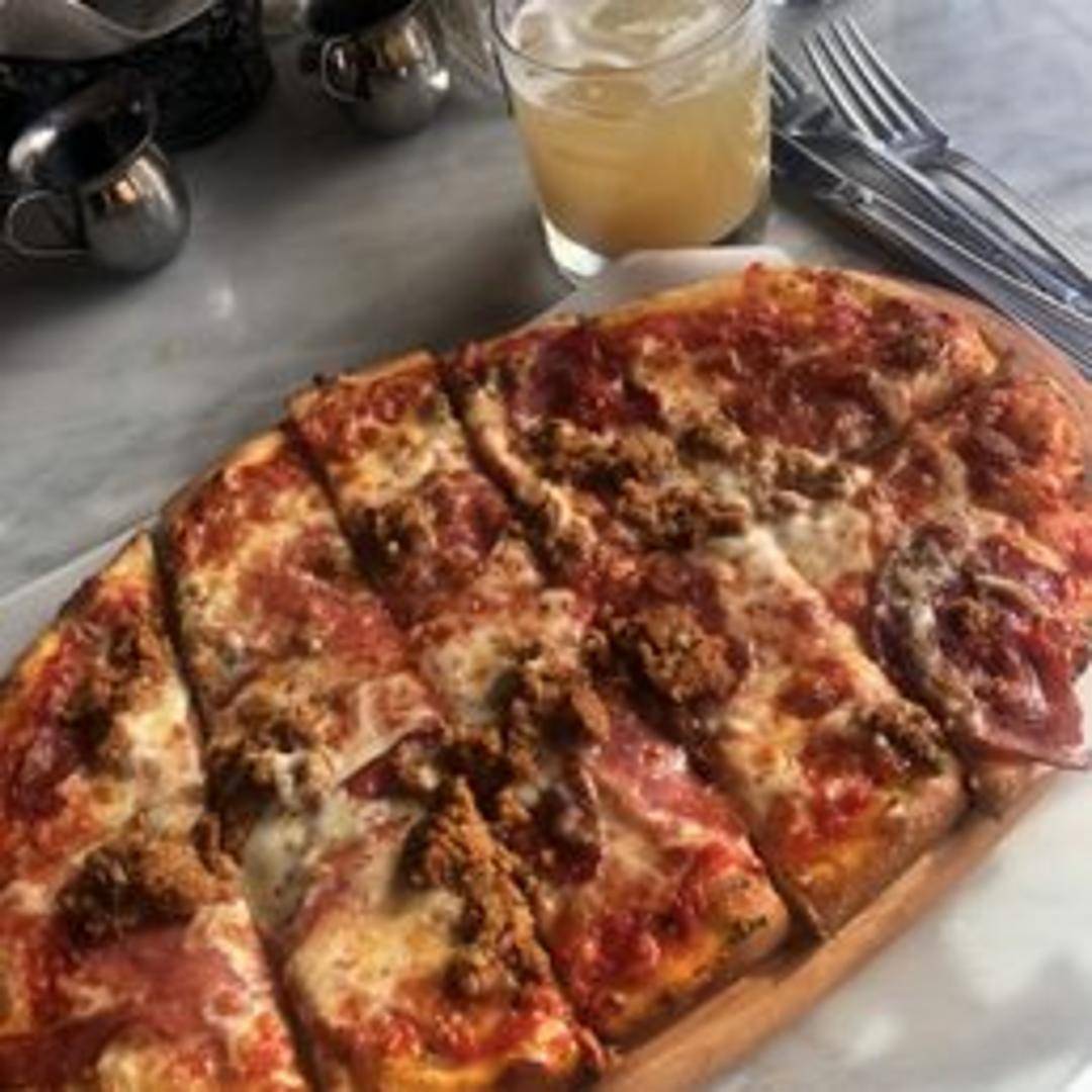 A rustic, rectangular pizza featuring a thick, focaccia-like crust that's crispy on the outside and airy within. Topped with a robust, herb-infused tomato sauce, a blend of mozzarella and provolone cheeses, and a sprinkle of oregano.