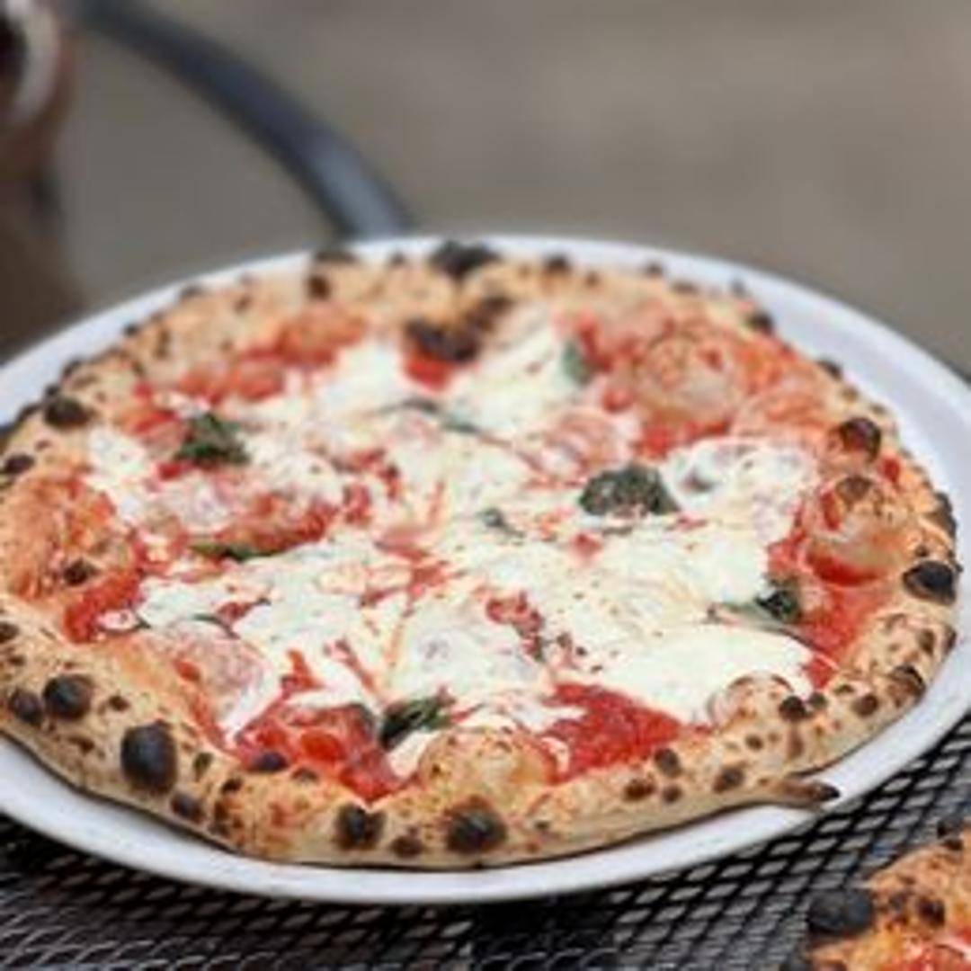 Classic Neapolitan pizza with San Marzano tomato sauce, fresh mozzarella, basil, and olive oil.
