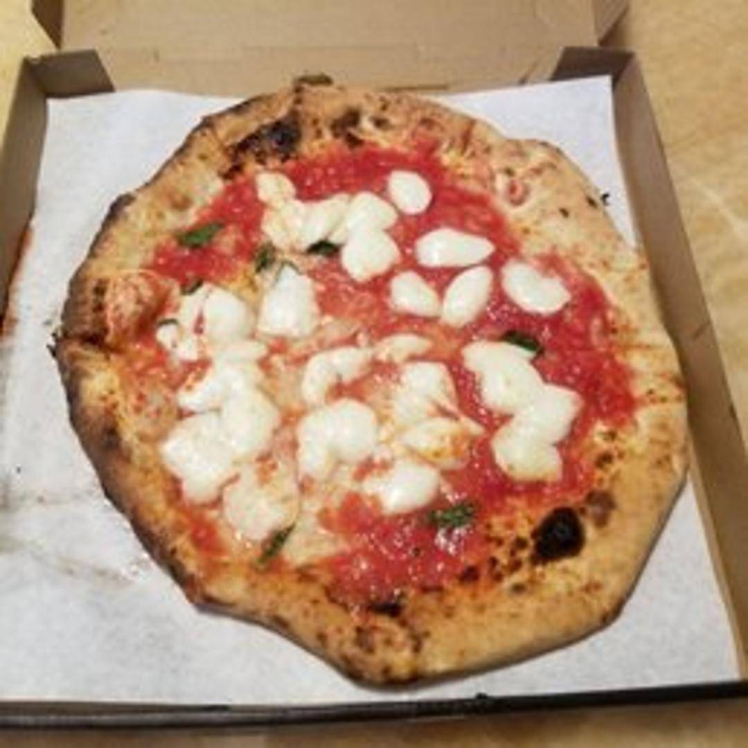 Neapolitan-style pizza featuring a thin, crispy crust, topped with San Marzano tomato sauce, fresh Bufala mozzarella, and basil. Cooked in a coal-fired oven for a slightly smoky flavor.