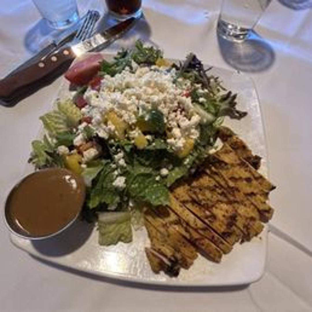 A refreshing salad with tomatoes, cucumbers, onions, Kalamata olives, and feta cheese, dressed with olive oil and oregano.