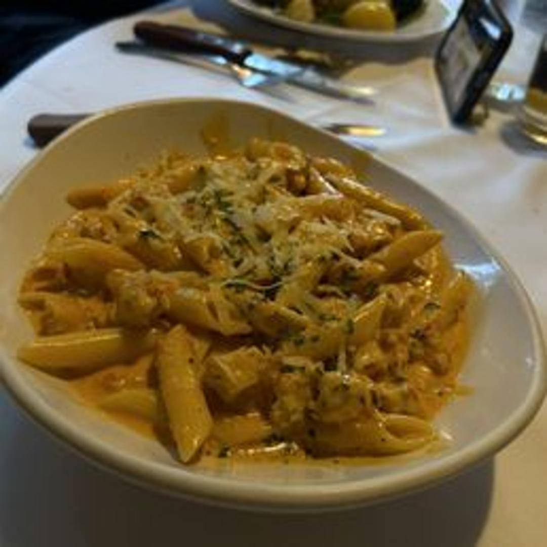 Penne pasta with tender chicken in a rich and flavorful sauce. Served hot with a sprinkle of parmesan cheese.