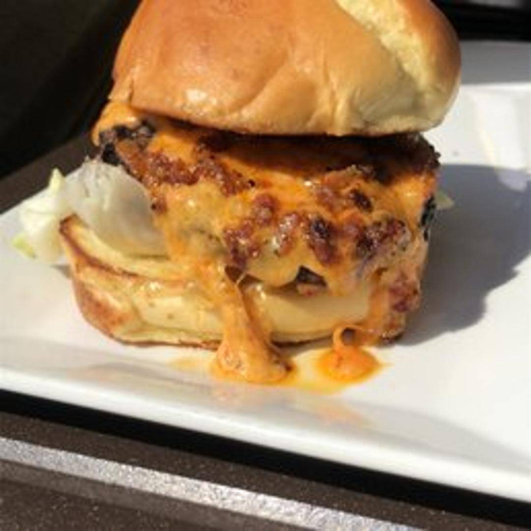 A juicy burger topped with pimento cheese, fried green tomatoes, and bacon on a toasted bun.
