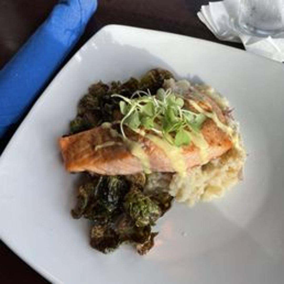 Fresh salmon fillet filled with a savory crab stuffing, baked or pan-seared and often served with a lemon butter sauce or hollandaise.