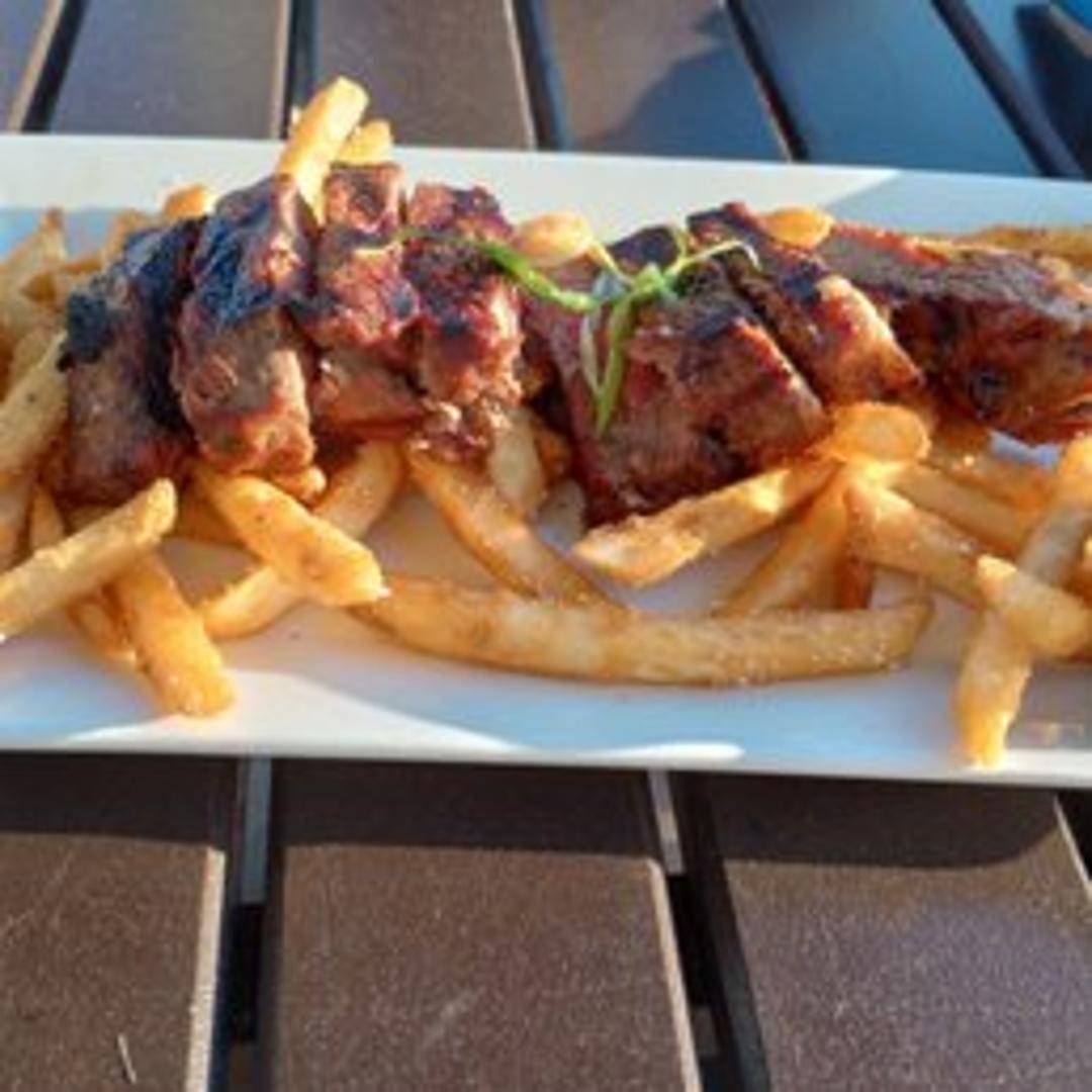 Grilled steak, cooked to your desired temperature, served with crispy french fries and a side of flavorful dipping sauce.