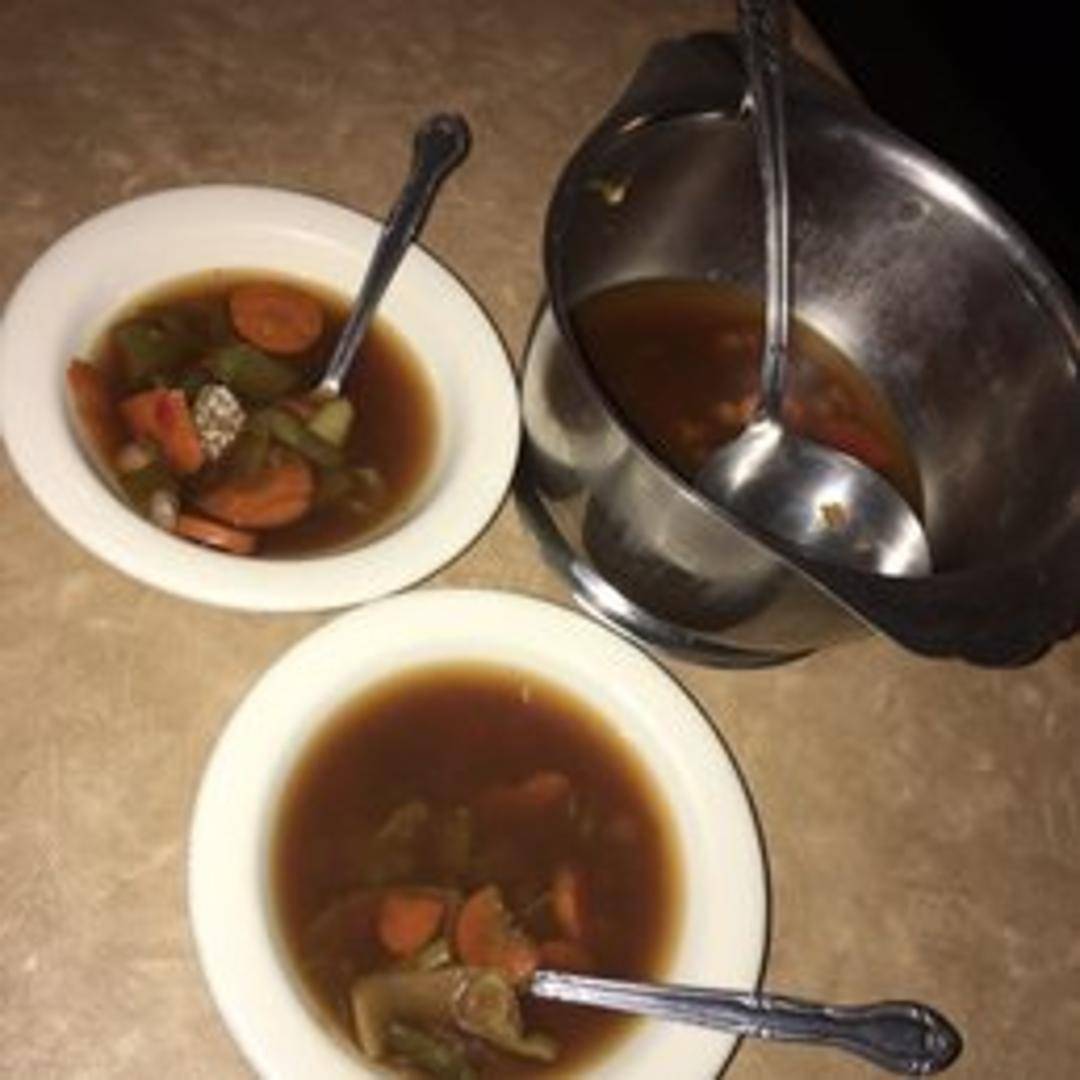 A hearty Italian vegetable soup with pasta and beans in a flavorful tomato broth.