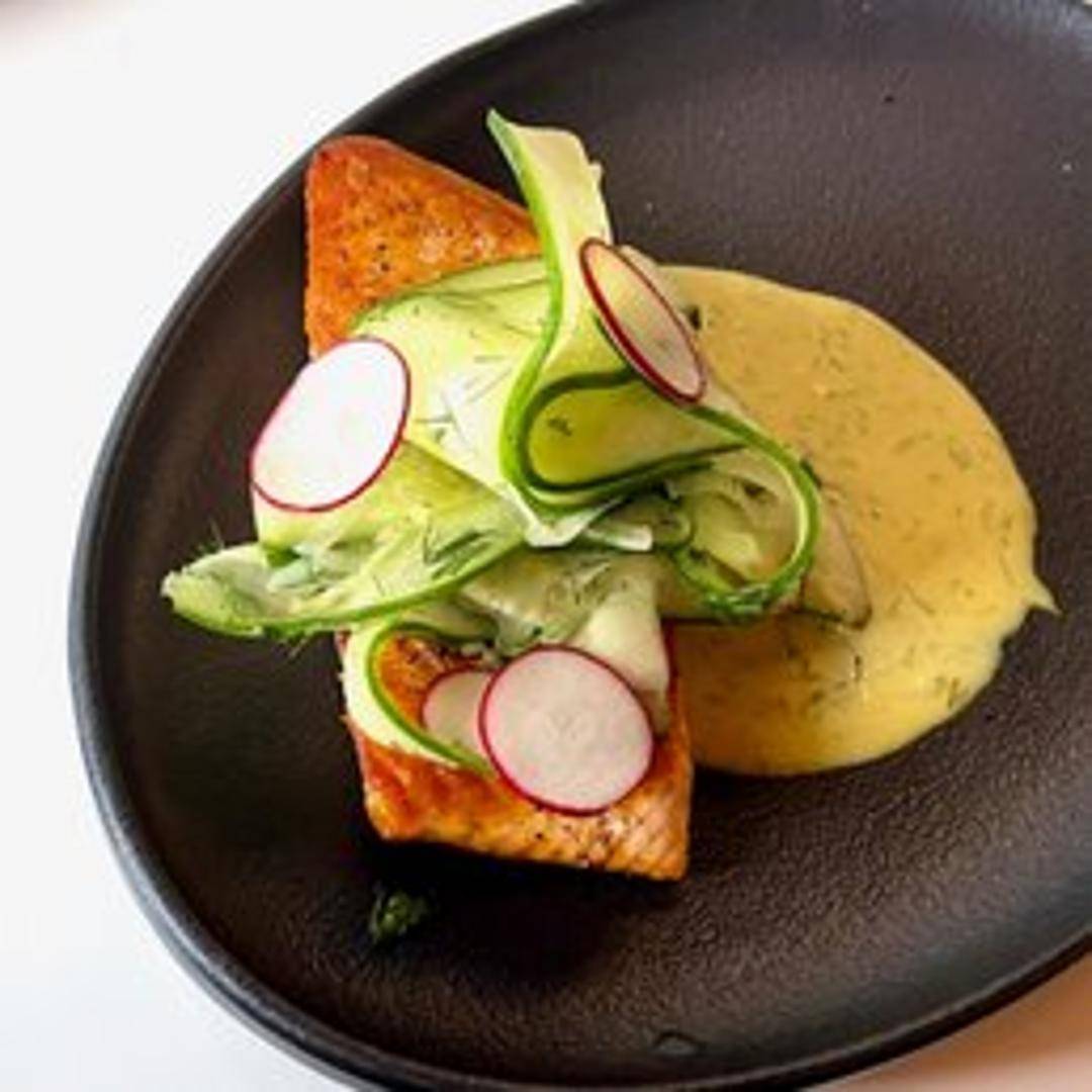 Indulge in a beautifully prepared salmon fillet, expertly roasted in our traditional hearth oven. This method imparts a delicate smoky flavor and a tender, flaky texture, ensuring a moist and succulent dish that showcases the fresh, rich taste of the salmon.