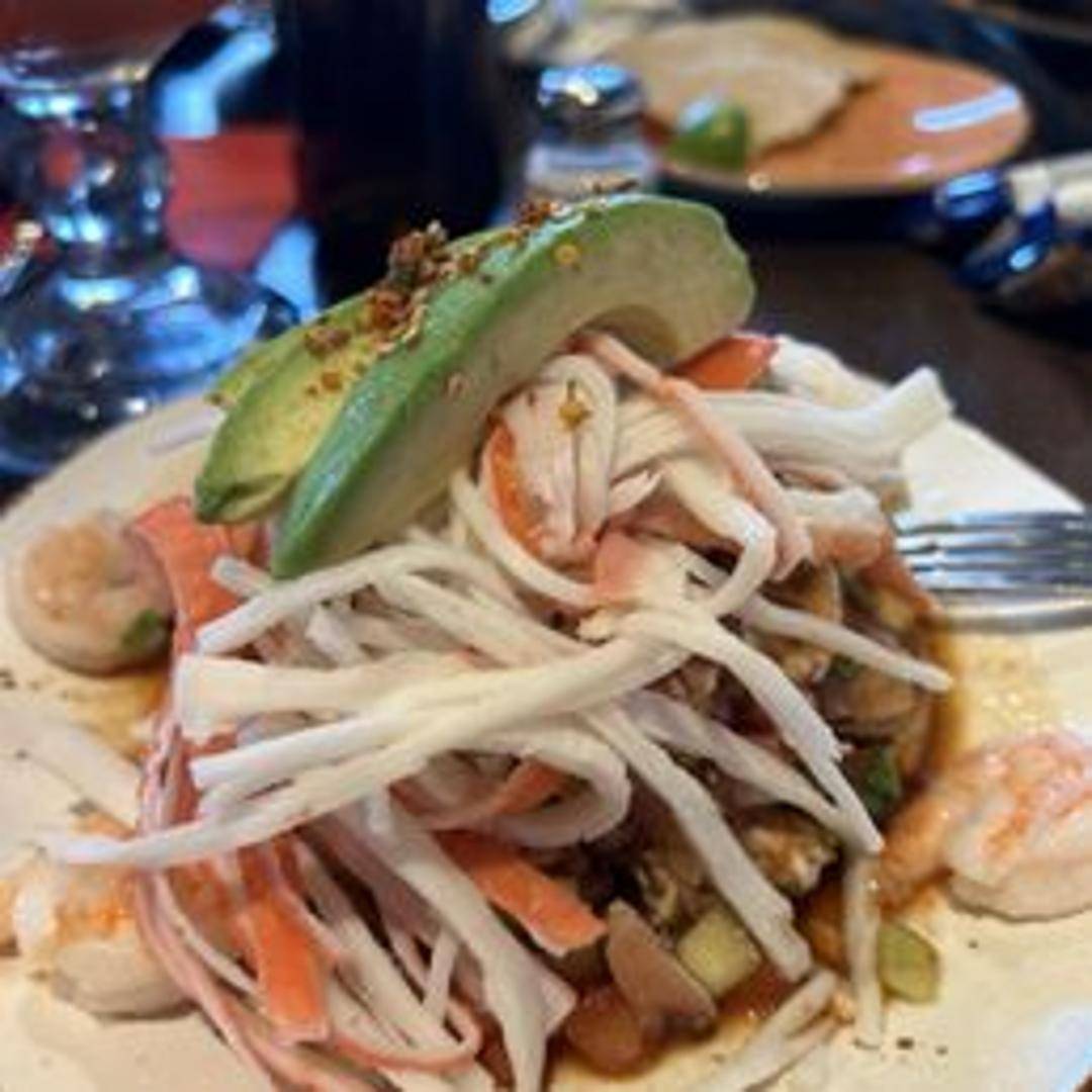 Crispy tostada shell topped with diced, fresh fish marinated in lime juice, mixed with tomatoes, onions, cilantro, and avocado.