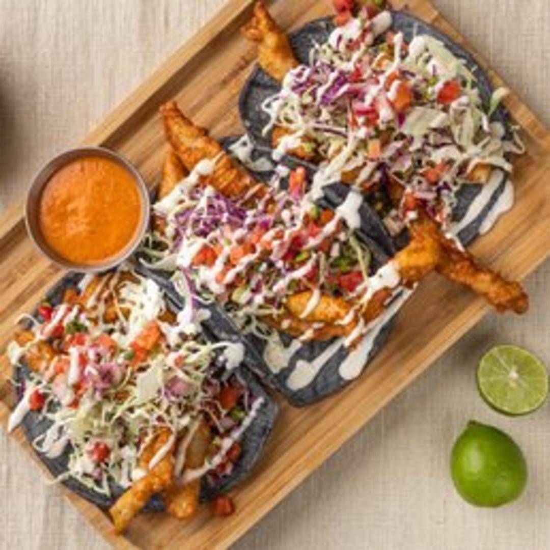 Crispy or grilled fish served in warm corn or flour tortillas. Typically includes shredded cabbage, pico de gallo, and a creamy sauce. May also include lime wedges and other toppings.
