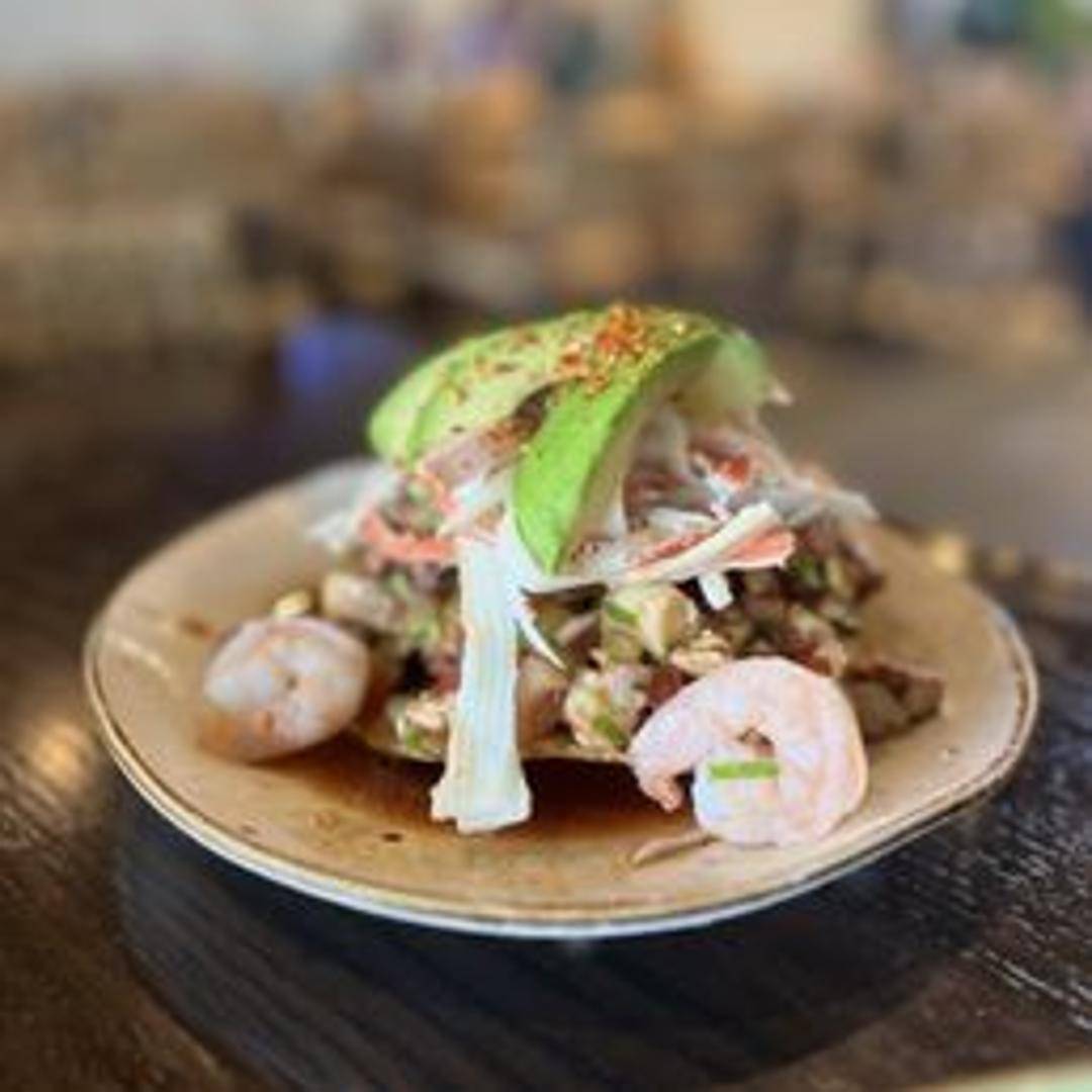 Crispy tostada topped with a mix of seafood including shrimp, octopus, and fish, marinated in lime juice and mixed with tomatoes, onions, cilantro, and avocado.