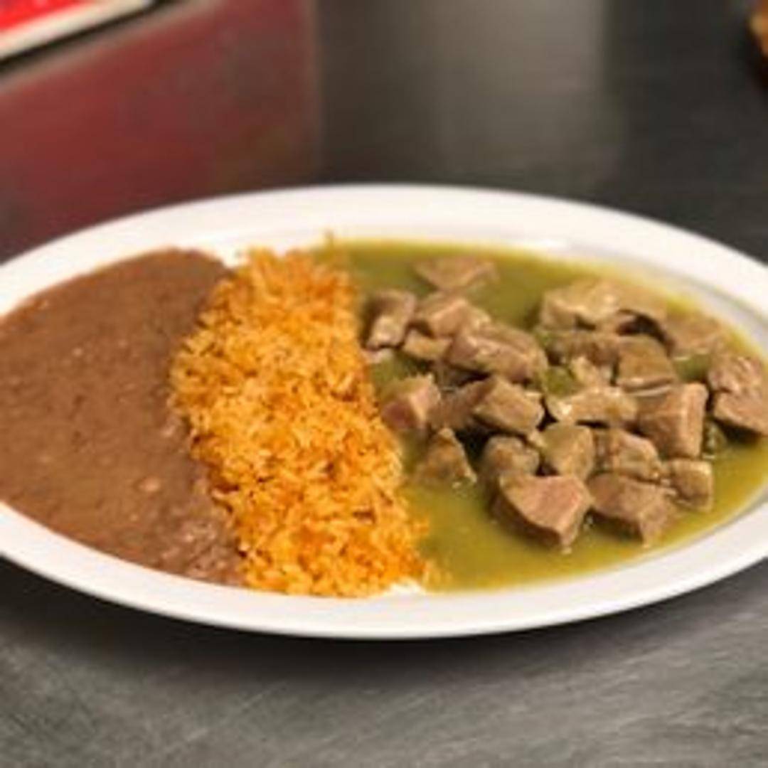 Tender pork simmered in a vibrant green sauce made with tomatillos, peppers, onions, and spices. Served with rice, beans, and tortillas.