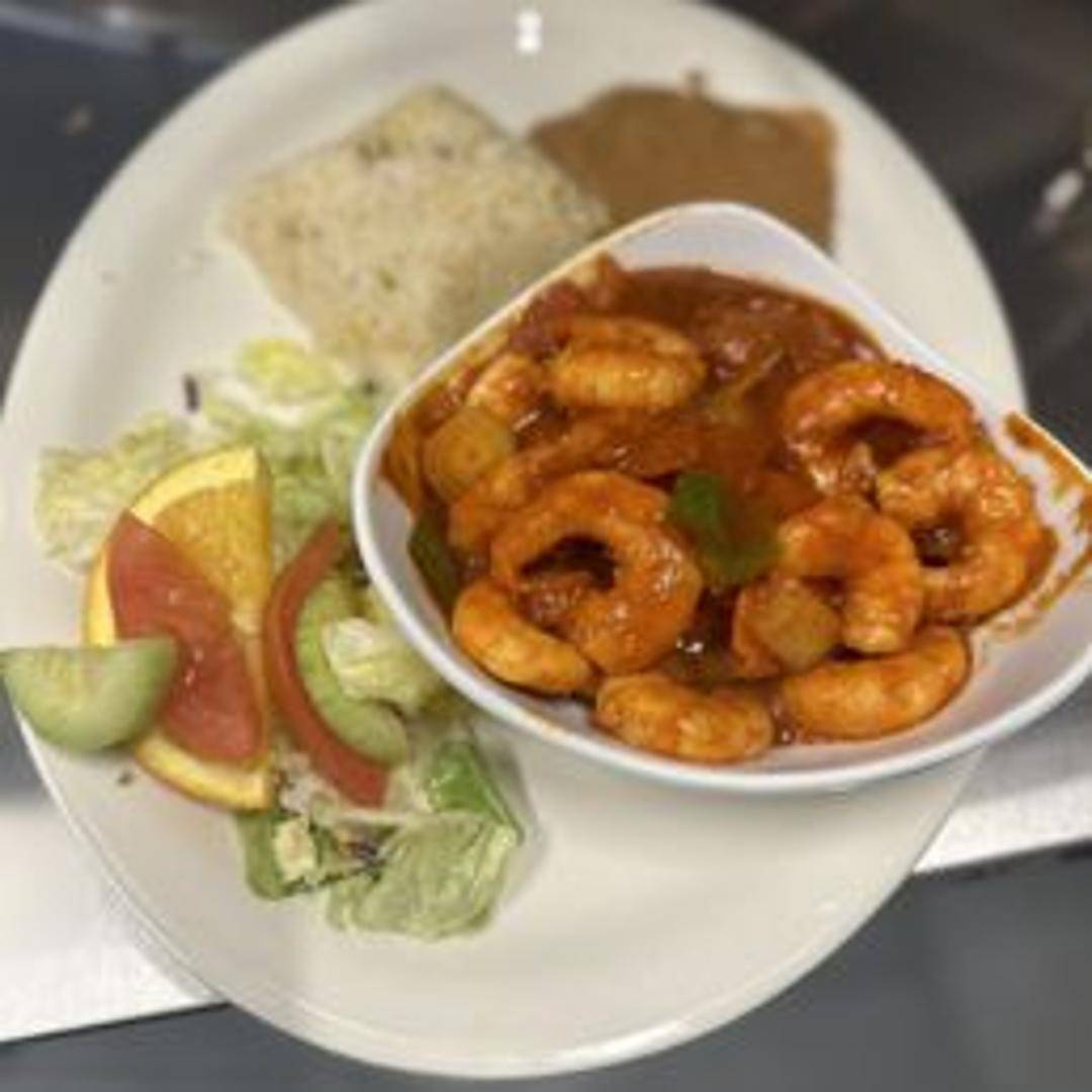 Spicy shrimp cooked in a fiery red sauce made with dried chili peppers, garlic, and spices. Served with rice and beans. A flavorful and intensely spicy dish for adventurous palates.