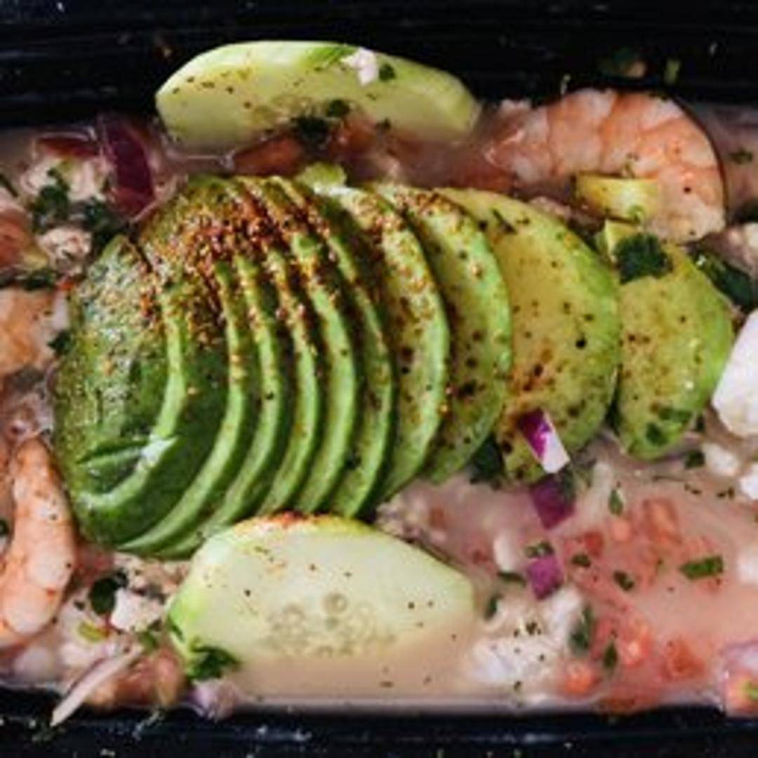 Shrimp ceviche marinated in lime juice and mixed with diced tomatoes, onions, cilantro, and sometimes jalapenos or other peppers. Expect a tangy and refreshing taste with tender shrimp.